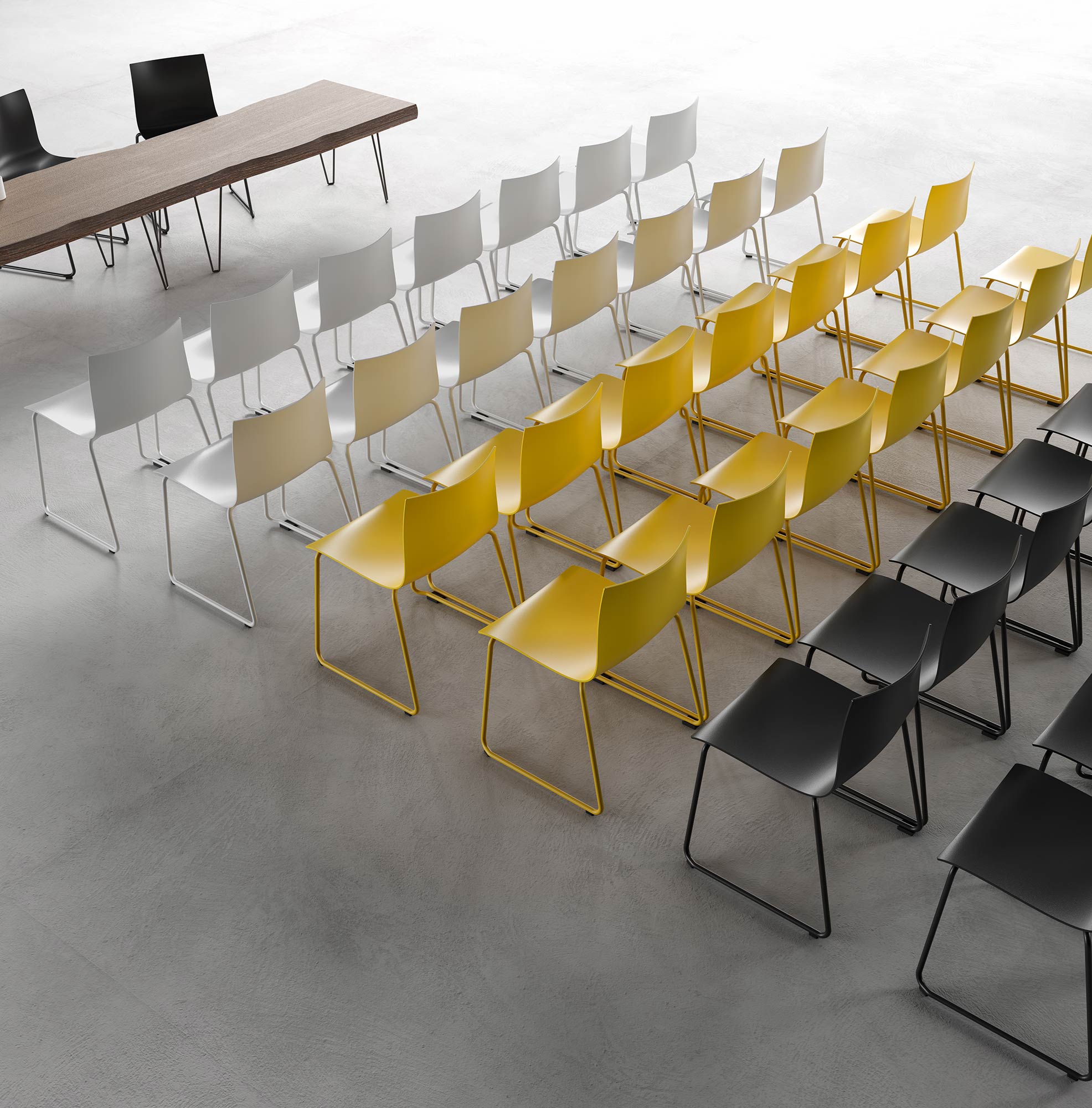 La colección combina calidad y versatilidad, distinguiéndose por la atención al detalle y la capacidad de adaptarse a los entornos con elegancia y funcionalidad. Los asientos diseñados para espacios compartidos abarcan desde soluciones monoplaza hasta bancos colectivos como Slimbench y Elettra. Todas las propuestas, desde las más sencillas hasta las más elaboradas, se diseñan y fabrican con tecnologías patentadas por la empresa.