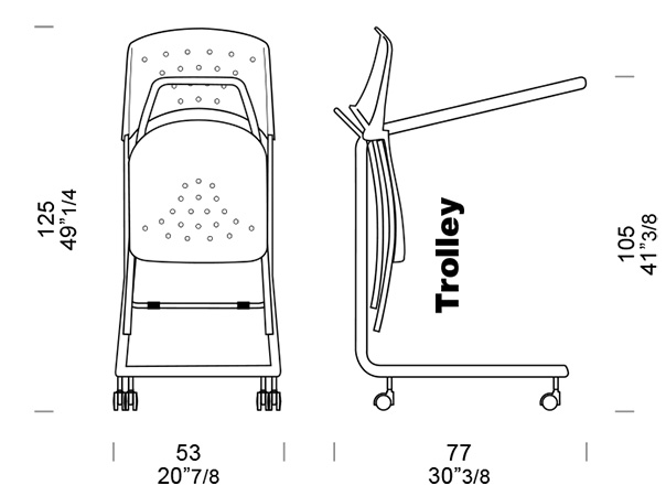 También representa una elección inteligente para quienes gustan de invitar amigos a casa y desean guardar asientos adicionales, ya que puede guardarse y trasladarse con su carrito (se vende por separado). Su estructura de hierro puede barnizarse en negro o aluminio o cromarse.