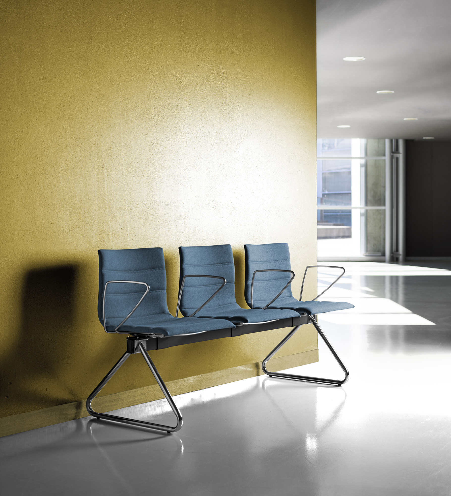 Fabricado para zonas de espera, este banco es adecuado para aeropuertos, todo tipo de estaciones y el sector sanitario.