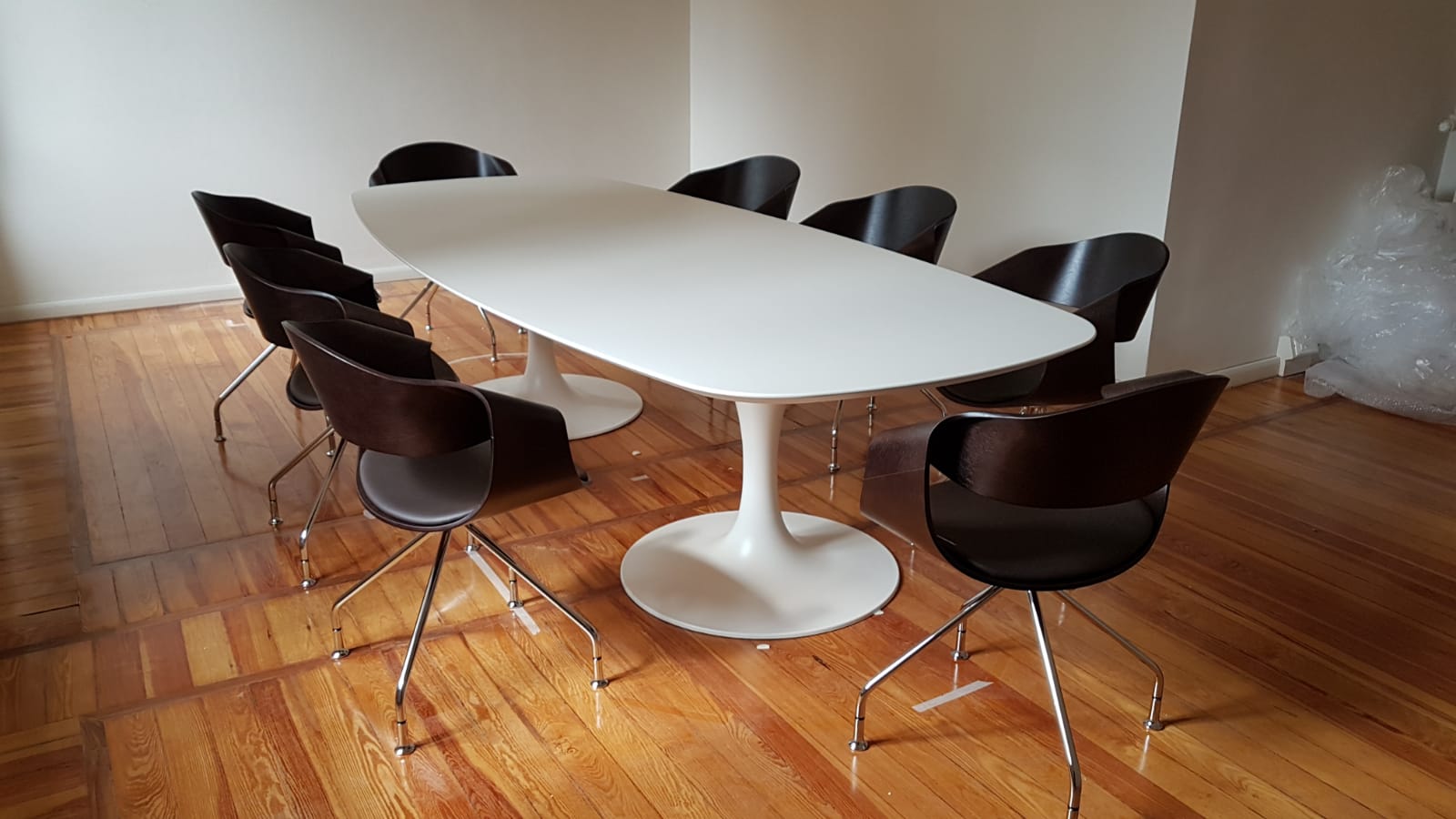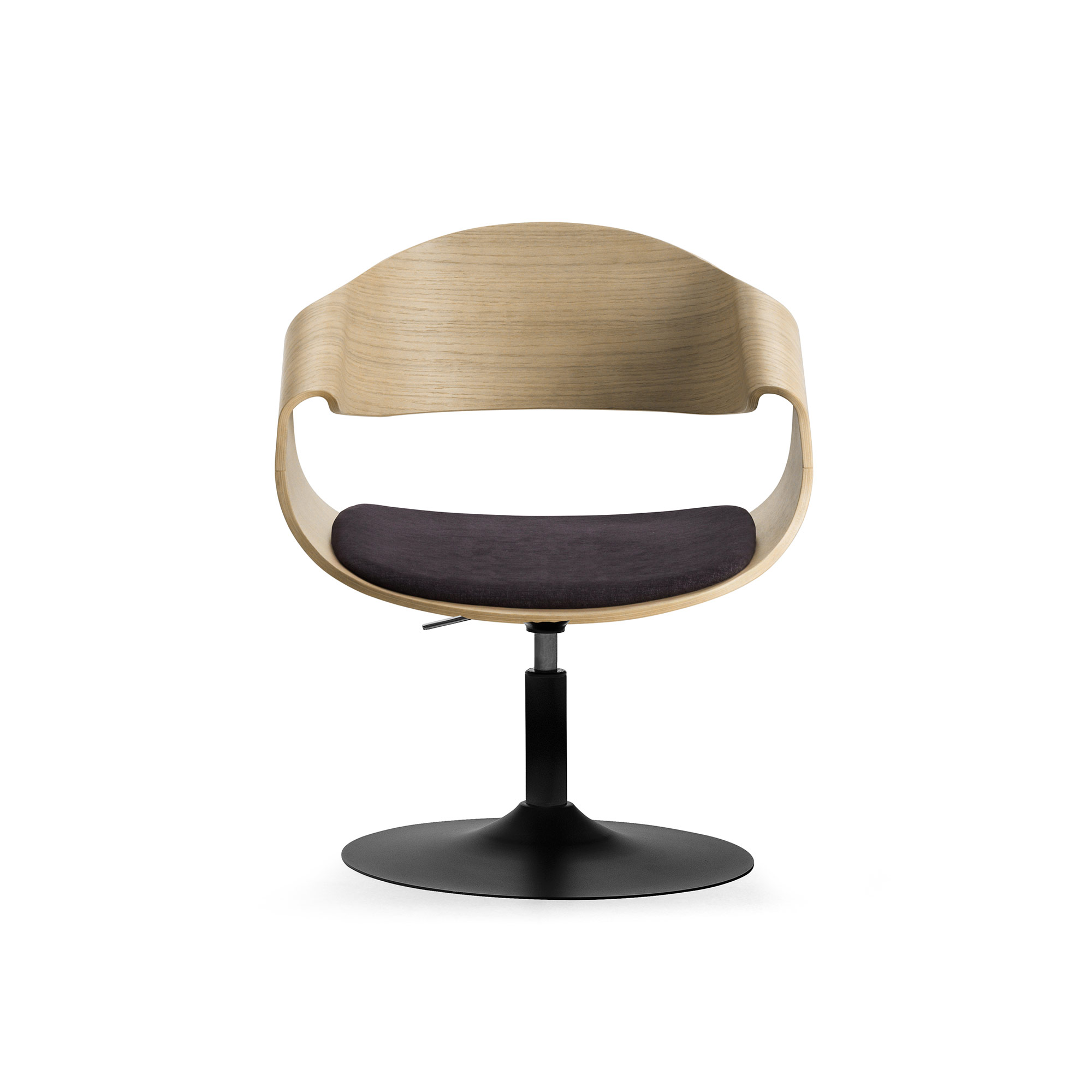 Madera contrachapada de haya lacada o barnizada. Base fija, giratoria o de 4 patas.